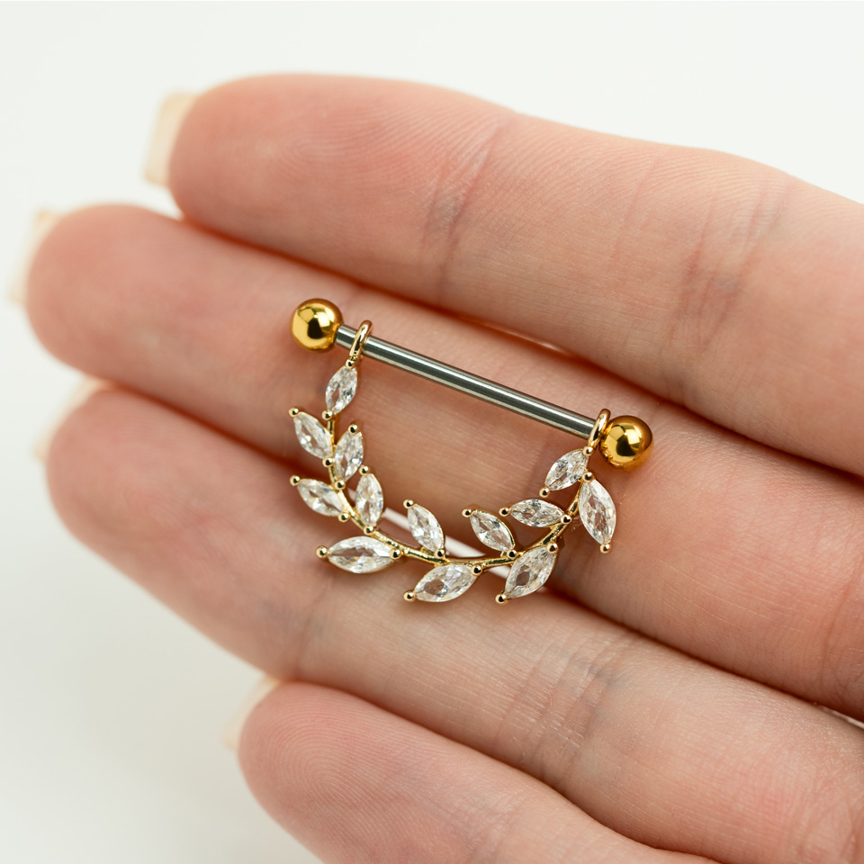 This nipple shield is perfect for you if you want a unique design. This nipple shield consists of a straight bar with a ball on each end. Both balls can be screwed on and off and can be replaced if desired. From the bar hangs a beautiful leaf with little oblong stones.
