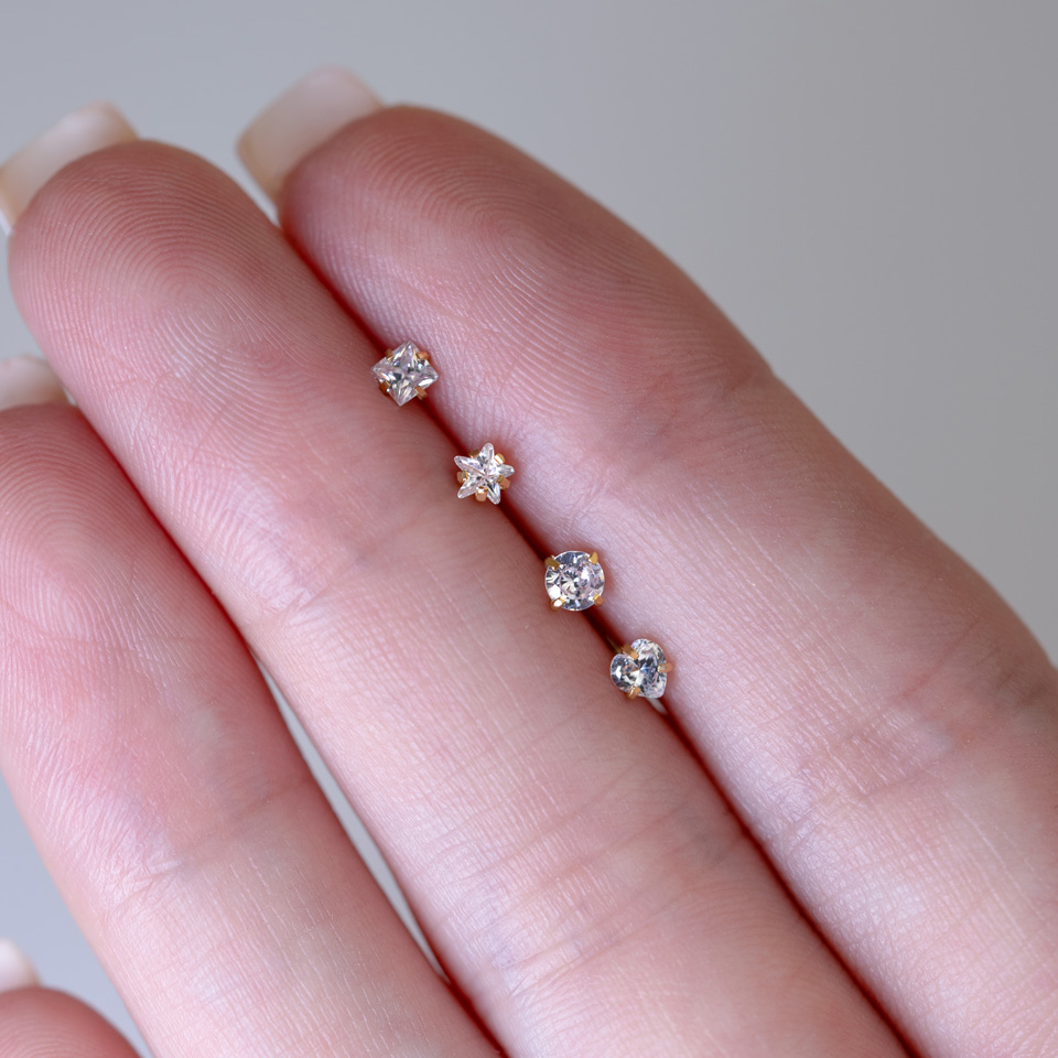 The stud is L-shaped, allowing a secure fitment without the risk of slipping out. The size of the bar is the same in all the models: a gauge of 20g (0.8 mm) and a length of 1/4" (6 mm). The size of the zirconia stone is about 1/8" (between 2.5 and 3 mm depending on the design). Lastly, it's worth mentioning that all of them are made of surgical steel.
