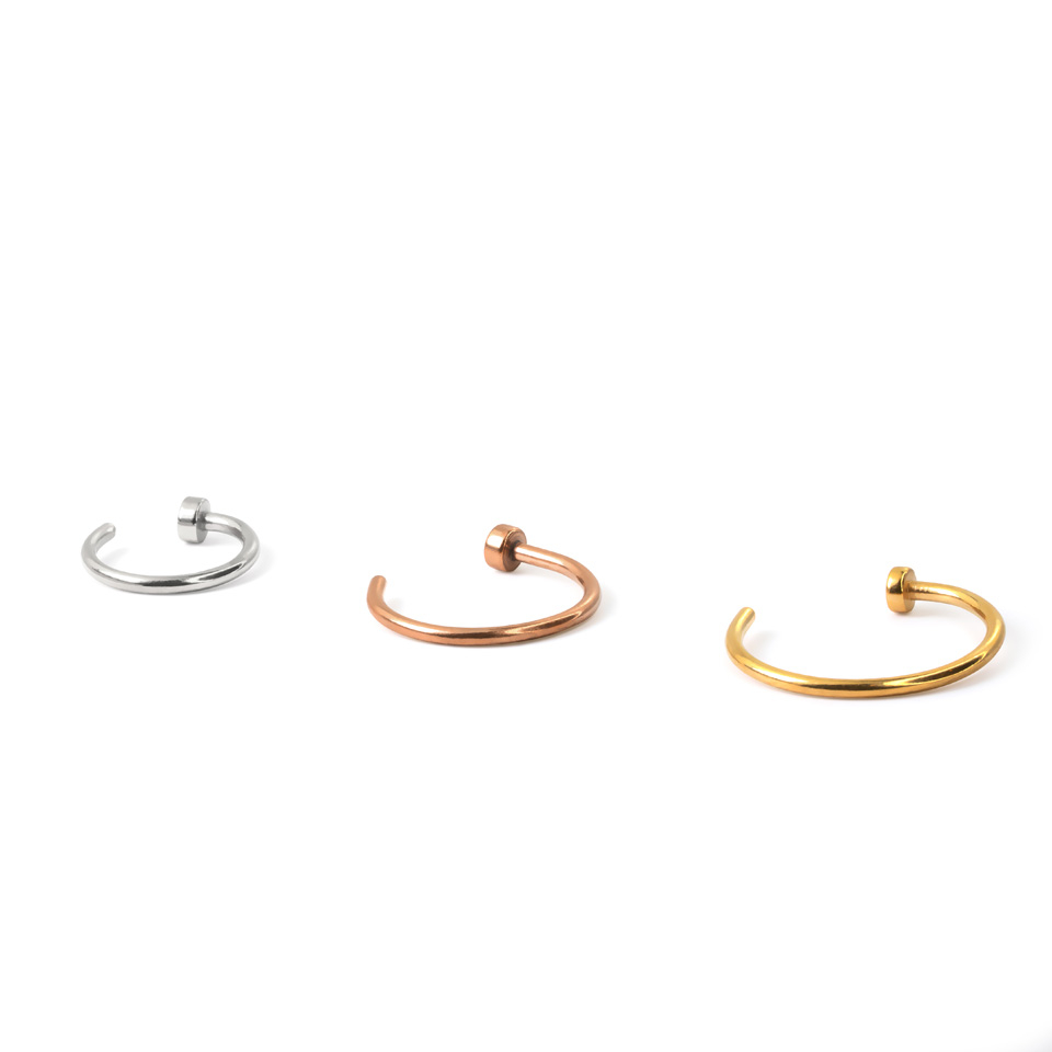 It's available in gauge sizes 18g, 20g, and 22g (1, 0.8, and 0.6 mm); it fits every kind of nose piercing, whether or not made with a needle. It's easy to put on and doesn't slip out thanks to a flat plate on one end. The fact that it's an open ring makes it easy to put in the piercing, even if it looks like an endless hoop when it's on.