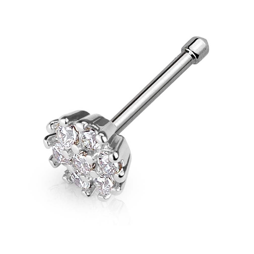 This nose stud is perfect for you if you want a very feminine and yet original look. This stud is slightly bigger than others, it has a diameter of approx. 1/4" (6 mm), and it's studded with clear stones that stand for a flower's petals and the heart. Besides, the design of the structure ensures that the stones won't fall off, so you will be able to enjoy having a very feminine style for a long, long time.