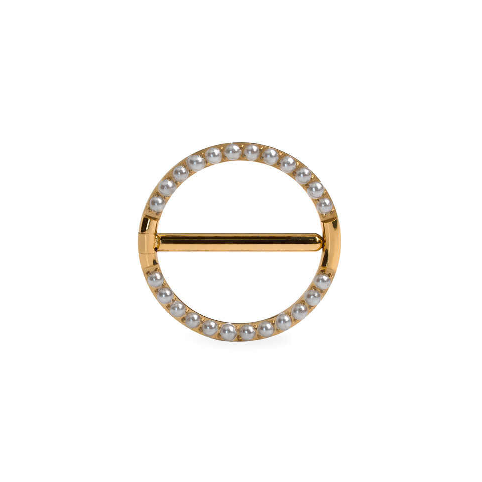 The pearl studded nipple clicker in titanium proves pearls aren’t just for necklaces. A full circle of prong-set pearls in gold or silver finishes frames your piercing with a wink of attitude.