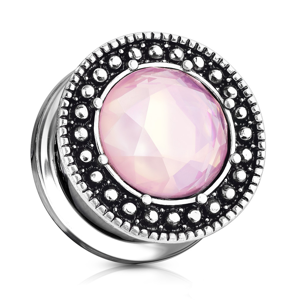 Plug with antiqued edge and pink gem