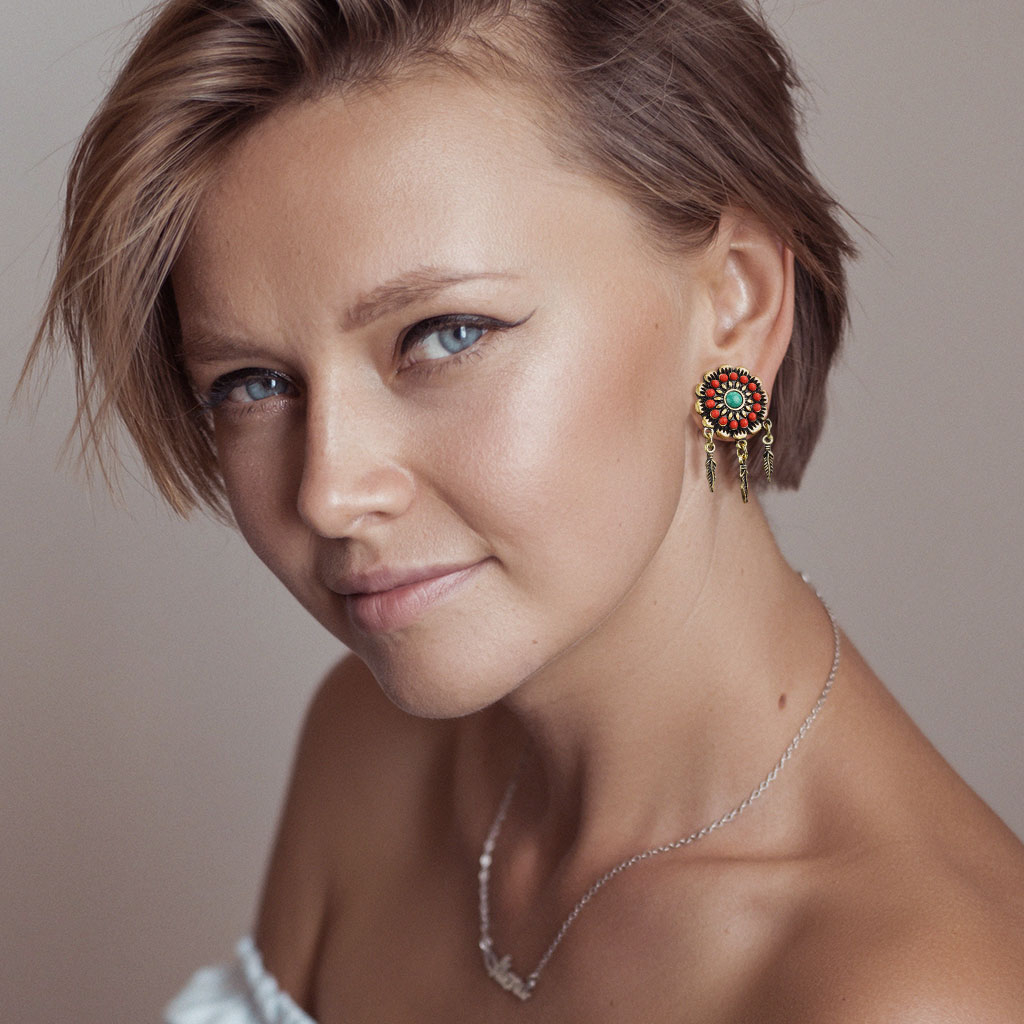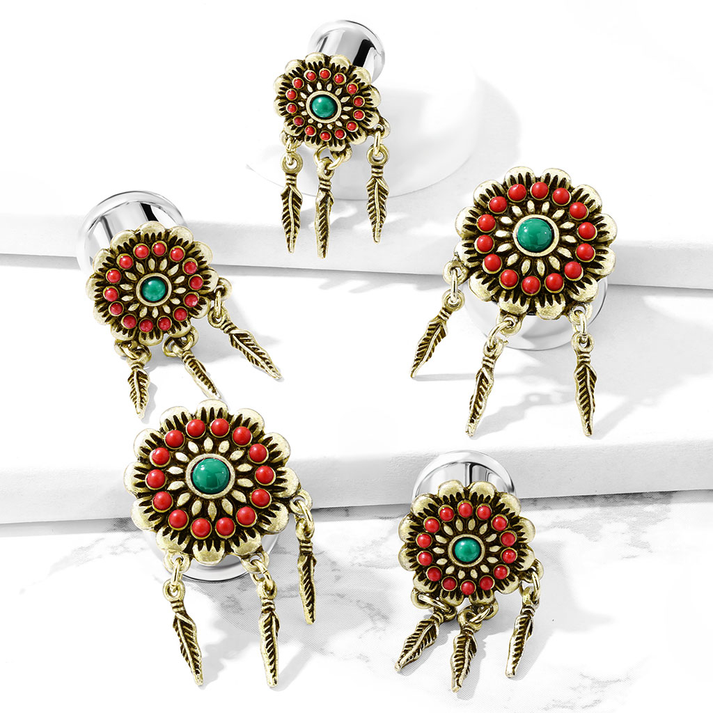 This plug features a decorative front that looks like a flower. The flower has a turquoise acrylic bead in the center that matches the red beads around it beautifully. Around the edge of the plug, a frame that consists of small leaves makes the flower stand out. Not only is there a flower with lots of details, but the plug also includes three feathers that hang freely and will follow your body movements.