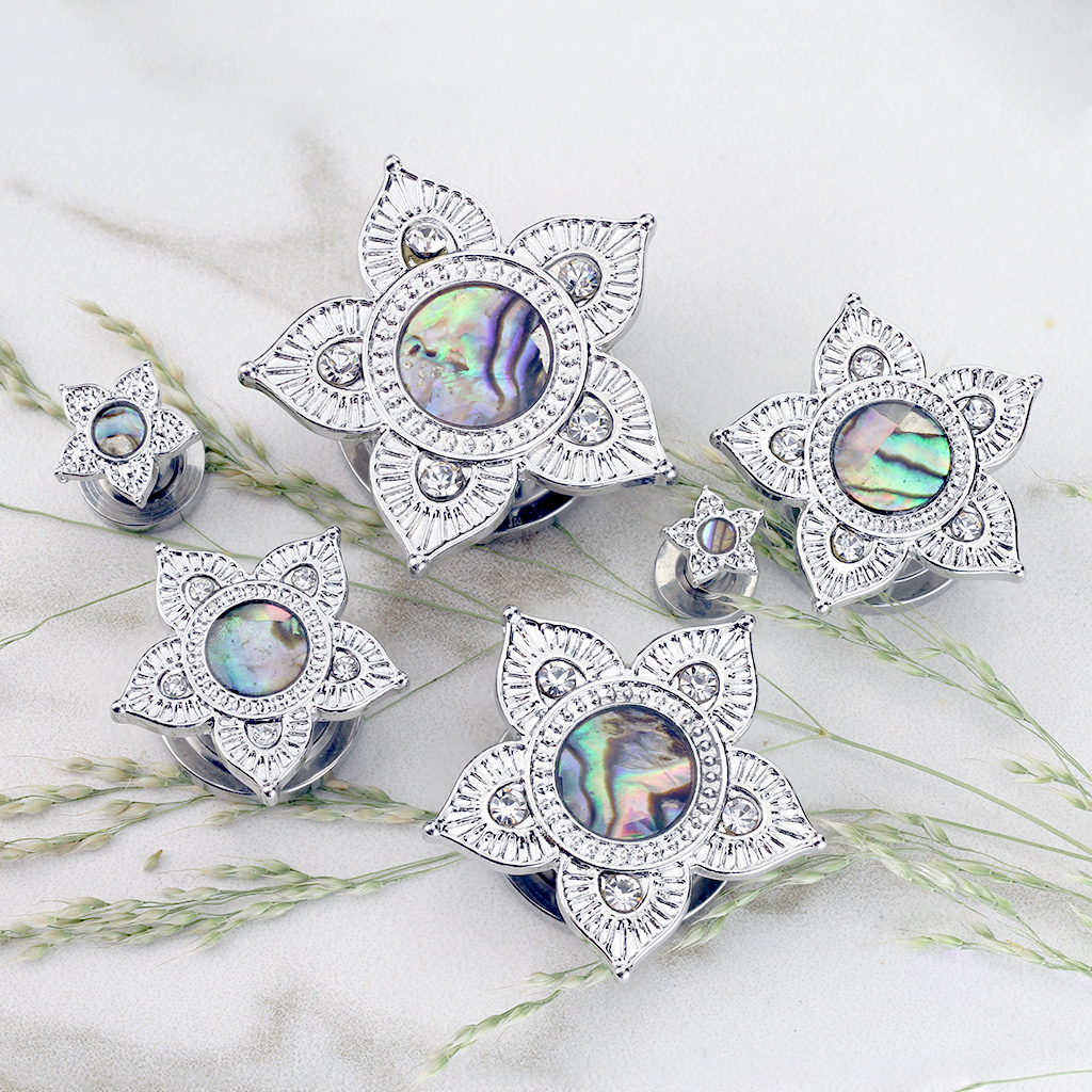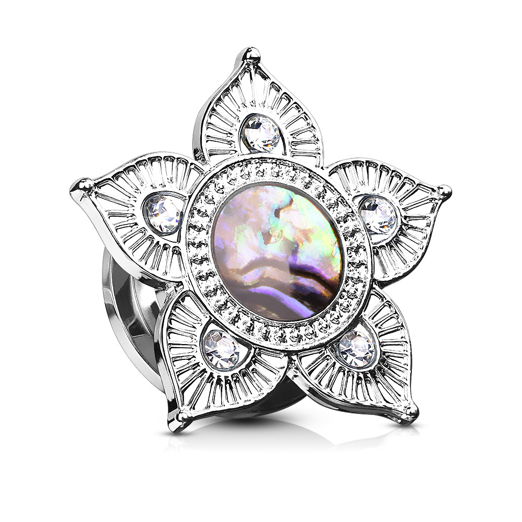 Plug with lotus flower and mother of pearl gemstone