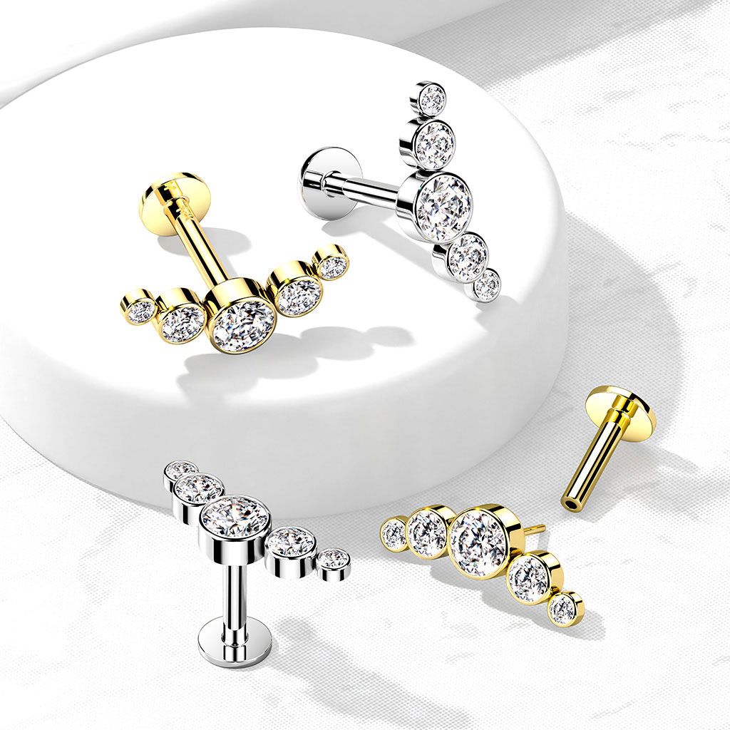 Name: Push-in labret made of 14k gold with 5 round bezel set CZ
