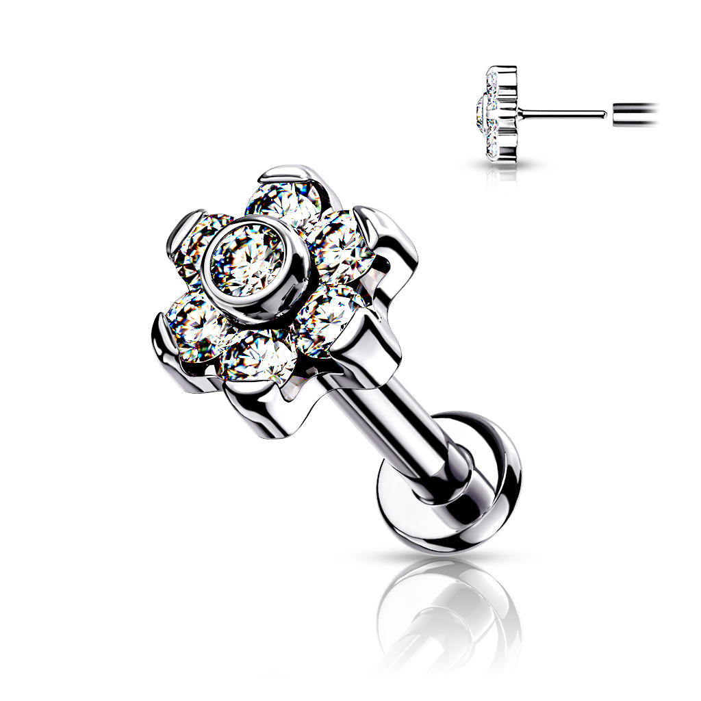 The top of the labret consists of seven tiny stones that together form a small flower -- a beautiful flower with six petals and a center stone. You can choose the color of the stones. A small pin is mounted on the back of the flower, which acts as a lock. You can simply pull the pin out of the bar, insert the bar through your piercing, and then press the pin into the bar again. The pin will sit in tension inside the bar. If you take it in and out several times, you may find that it gets easier with time. But don't worry! You can easily fix this by putting the top half into the bar and giving it a light bend. This will make the tension of the pin in the bar stronger again.