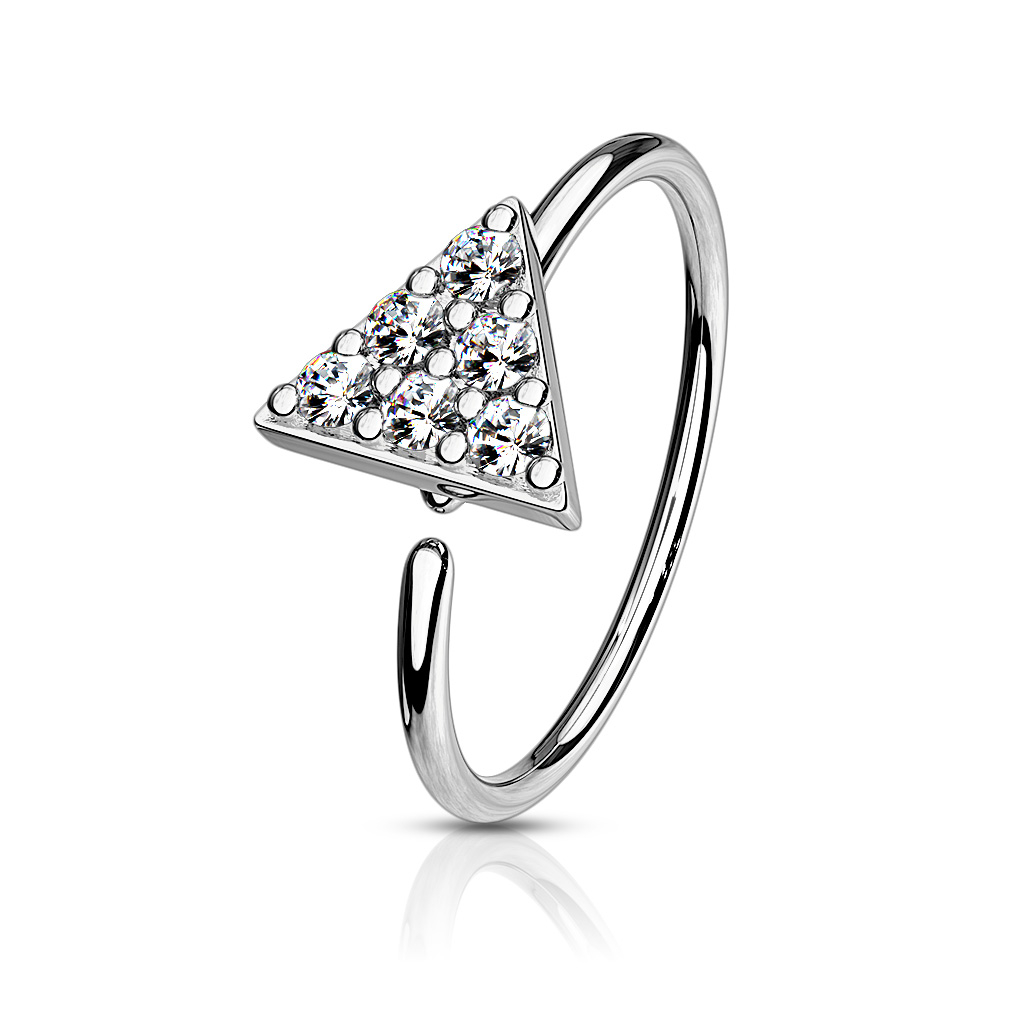 On the front side, the ring is decorated with a triangle, studded with many tiny clear stones that shine bright.