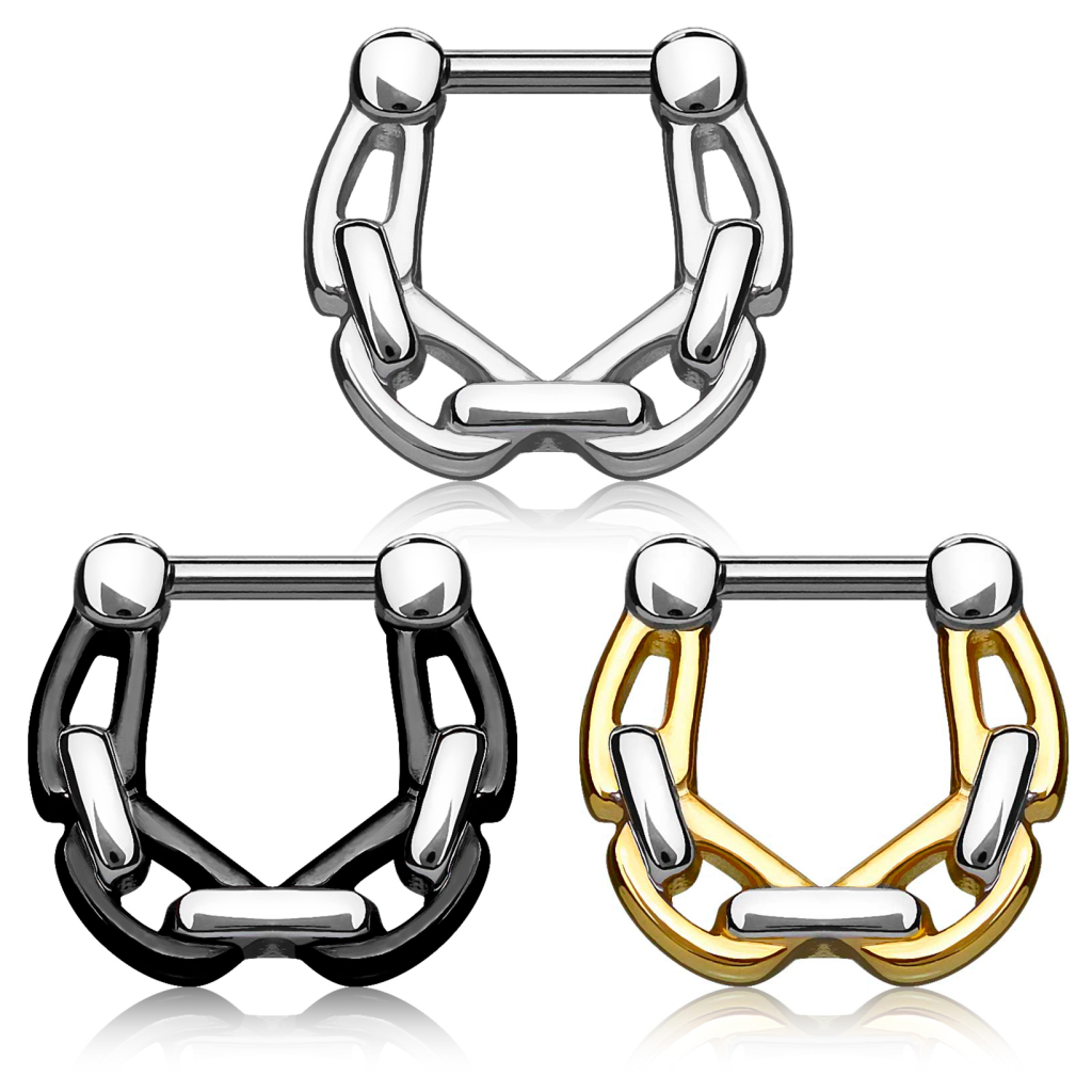 This septum clicker is available in three different colors. The silver color model is surgical steel, the gold one is gold-plated, and the black one has a black color layer. The coating is on one out of two links of the chain, so only 4 out of 7 links are black in the black model, the rest are plain surgical steel. The same goes for the gold-plated links.
