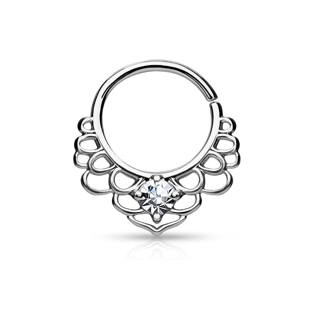 This septum ring is available in two different colors. Both models are identical in shape and size, and they also hold the same clear stone with a unique touch. The stone sits in the center of the ring and measures approximately 5/32" (4 mm).