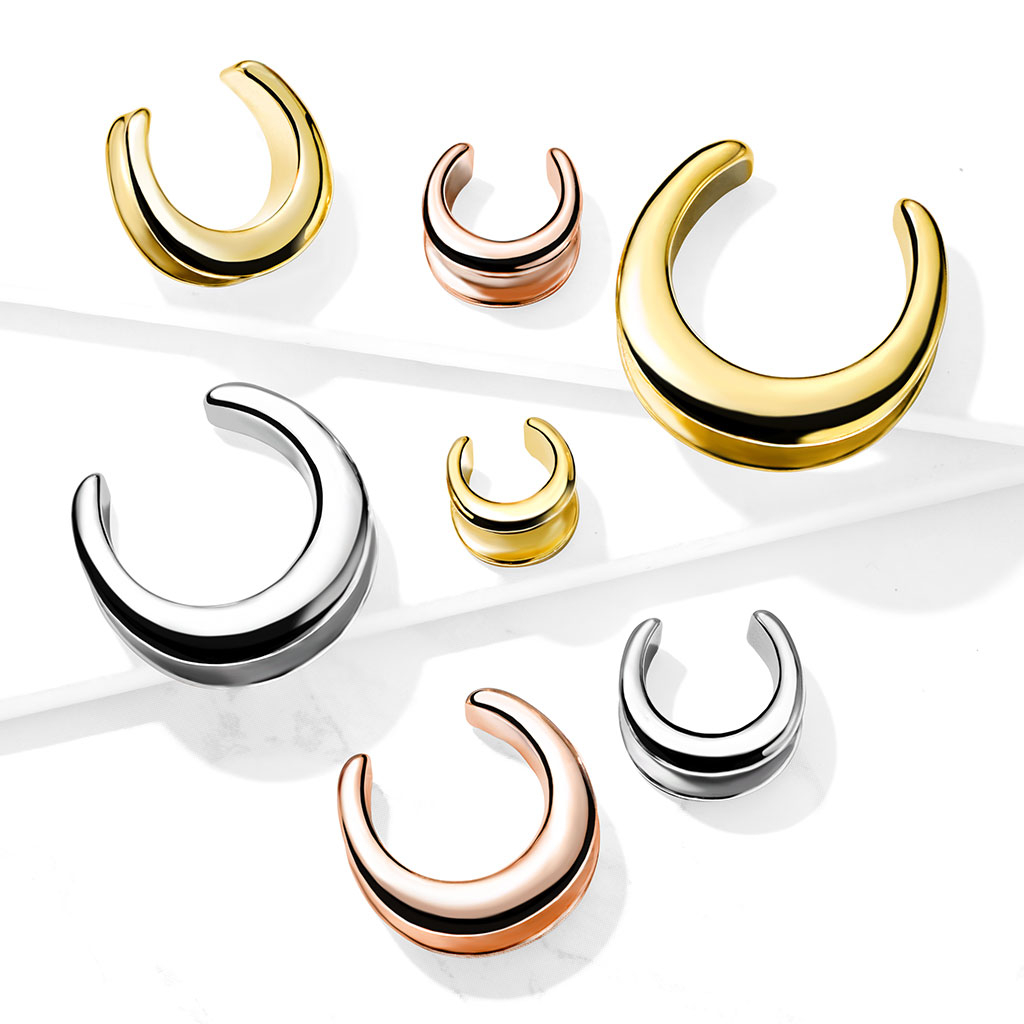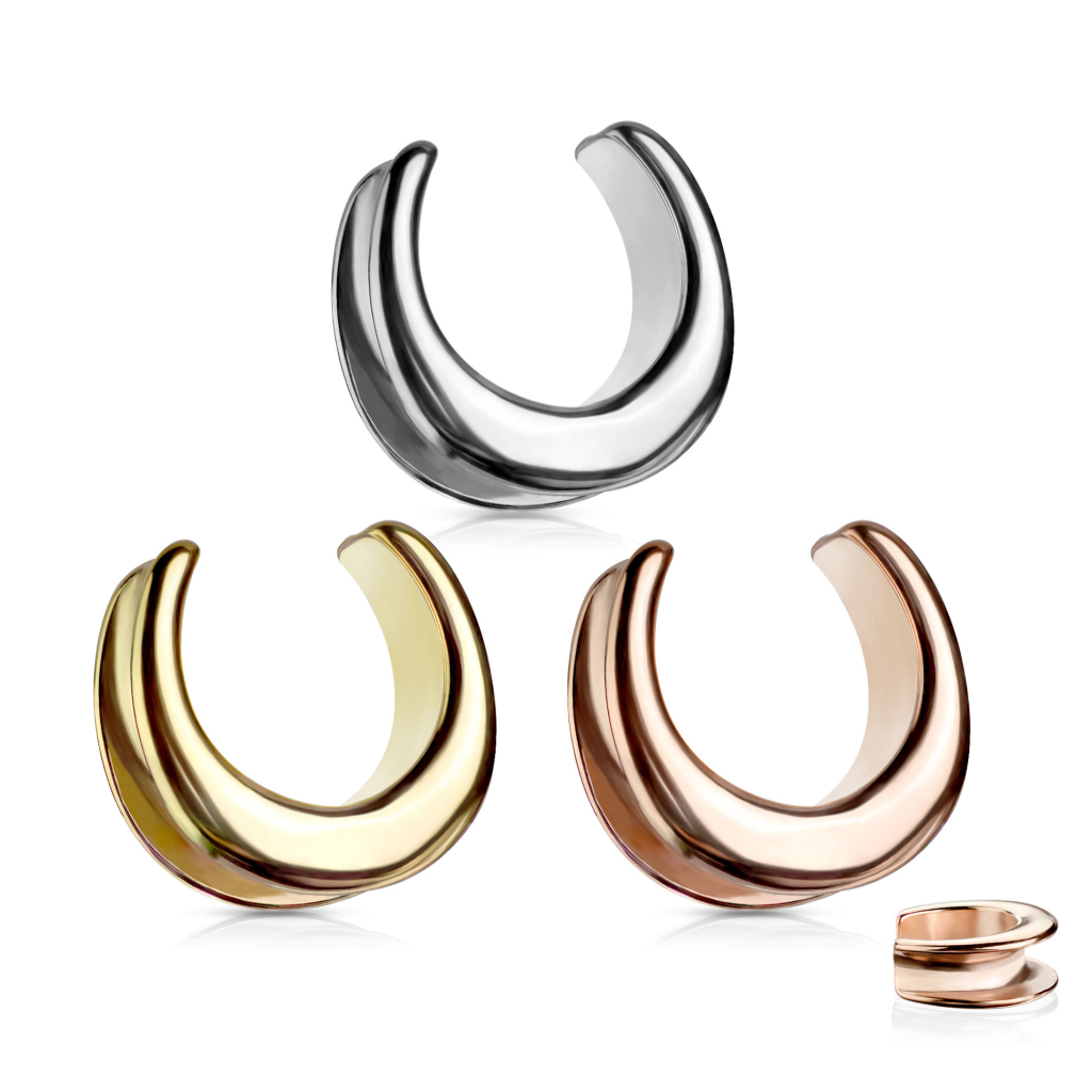 The piece of jewelry you see here is a little hard to categorize. It's called a saddle spreader, which is neither a tunnel, a plug, nor a hanger. Nor is it a taper at all. The closest is perhaps a tunnel, as you can see through it. However, this one is open at the top, which also has the advantage that you can use it even when your ear gauge is larger than the diameter of the jewelry. The edges of the spreader curl inwards, making them encircle your earlobe stretching. Thus, even if it's smaller than your gauge, the jewelry won't fall out.