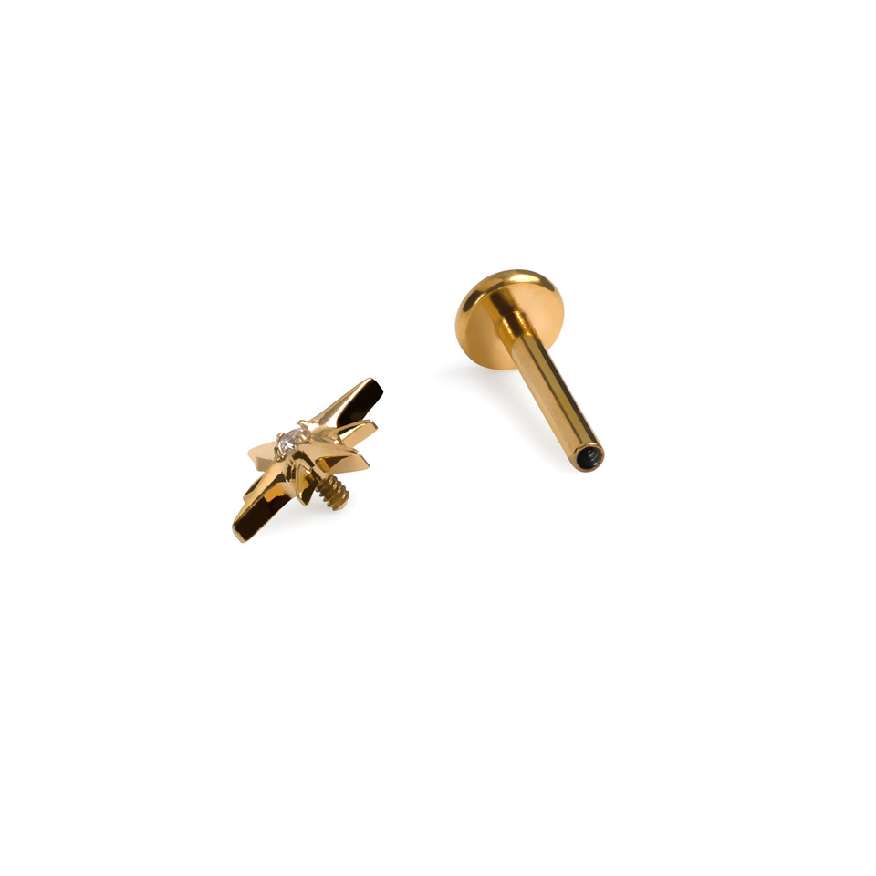 The star labret with central stone in titanium is made for those who like their jewelry with a little cosmic drama. Its star-shaped design frames a central stone. Available in gold and silver finishes, it’s a standout detail for any ear stack.
