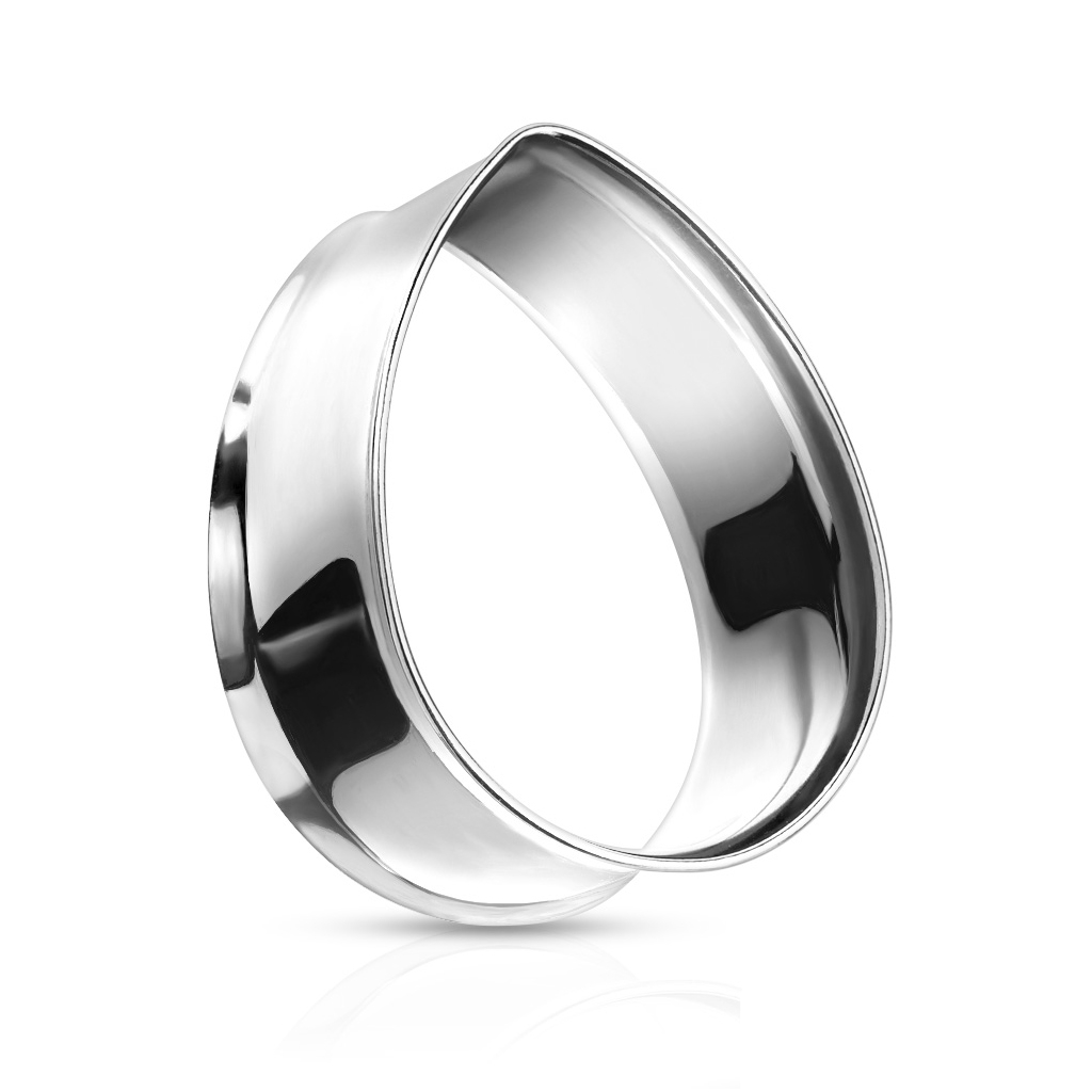 The tunnel you see in the picture is made of surgical steel. The thickness of the metal is incredibly thin, so it may appear smaller than it actually is. The thickness is approximately 0.02" (0.5 mm). The tunnel is teardrop-shaped, or pear-shaped if you like. You could almost say the drop is a bit chubby.