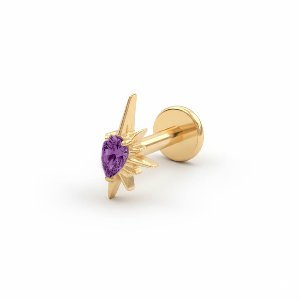 The titanium half sun labret is proof that even a tiny stud can have main-character energy. Its half-sun design frames a prong-set gemstone, available in both transparent and purple color.