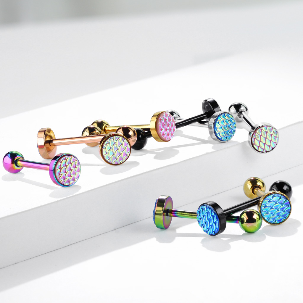 In the picture above, you can see a very original tongue barbell. It features a top ball with a nuance-changing surface that looks like scales. The scales are made of a resin that provides changing hues according to the light. If you choose the model with pink scales, you will see different pink nuances as you move it. Besides, you can also choose from different barbell colors - all adding a different and fresh touch to the barbell.