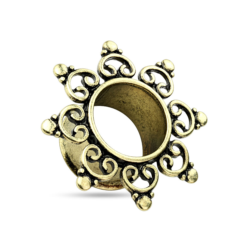 The tunnel is made of surgical steel with a coating that gives it an antique gold look. The tribal is made of brass, which also matches the antique look.